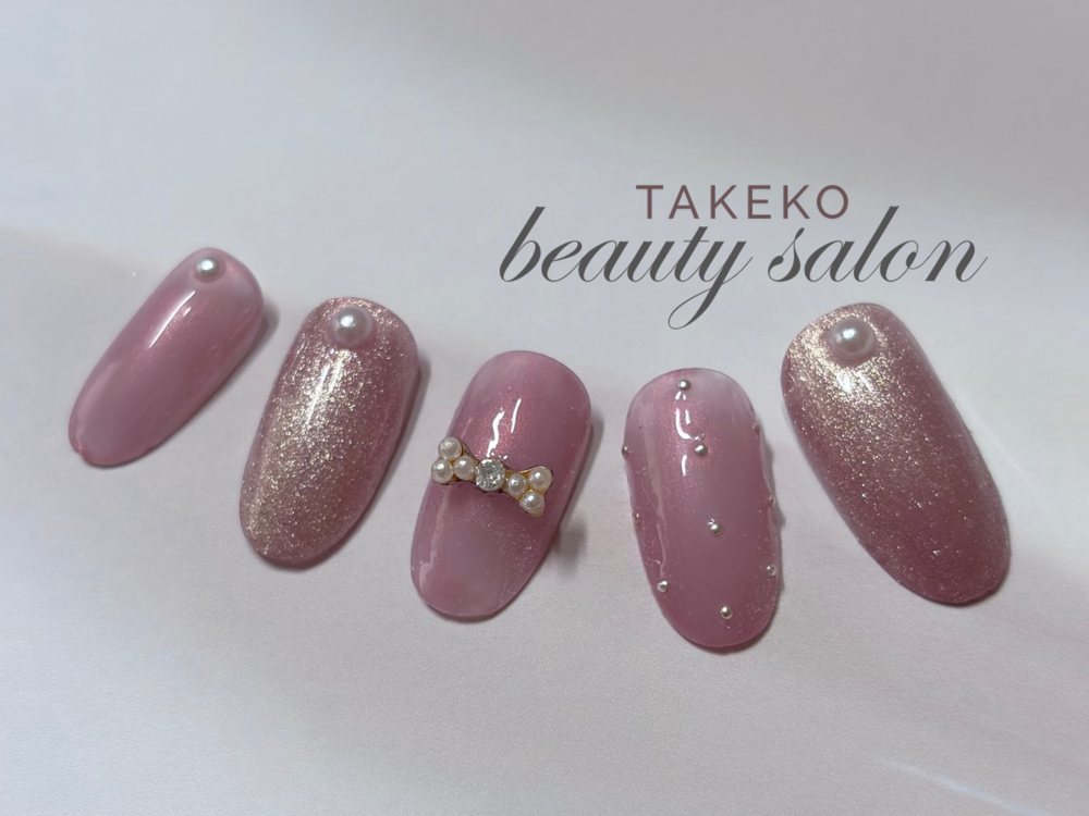 パール感とリボンが可愛いピンクネイル💅